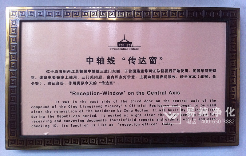 進入府邸之后,其它歷史古跡自然引起筆者深厚的探究興趣,可能是因為筆者是從事潔凈室無塵車間建設行業(yè),尤其對類似于現(xiàn)代潔凈室相關的設備特別感興趣。當時因看到一個類似于今天的傳遞窗,特拍照下來,與諸位從業(yè)人士共享。此傳遞窗當時稱之為傳達窗,意為傳達室,傳遞聲音和文件的窗口,現(xiàn)如今的凈化室中,稱之為傳遞窗,原先的傳遞窗也是為兩道門,只是不具備今天的傳遞窗應用了電子控制的互鎖。那時的門衛(wèi)和守兵如果只能靠手動來控制傳遞窗的門栓了。