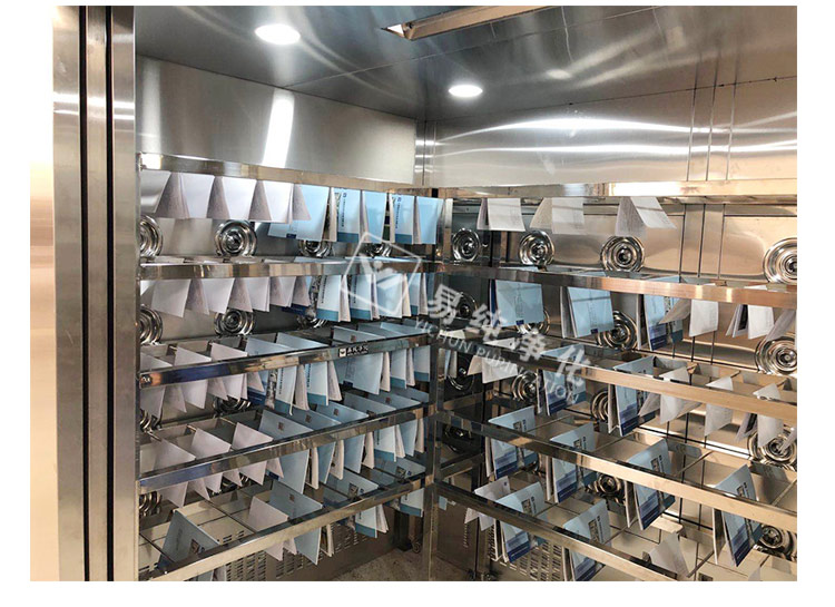 工作原理介紹:檔案消毒除塵室采用全不銹鋼材質(zhì)制作,進(jìn)門為自動感應(yīng)雙側(cè)是移門,人員觸碰按鈕后開門,將托盤送入到除塵室內(nèi),人員退出后關(guān)閉自動門,當(dāng)門關(guān)閉后,除塵室內(nèi)啟動風(fēng)淋除塵,此時自動門鎖閉,工作報警指示燈顯示為紅色狀態(tài),門無法打開。當(dāng)除塵時間到達(dá)后,報警指示燈顯示為綠色并發(fā)出報警聲音,門為可開狀態(tài)。人員取出托盤,將之送入到庫房內(nèi)進(jìn)行保存。