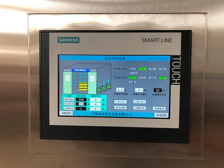 5)工作指示燈指示工作狀態(tài),時間未到,門無法打開;達(dá)到設(shè)定的時間后,指示燈變綠,可選擇繼續(xù)長時間消毒或開門取出檔案車。